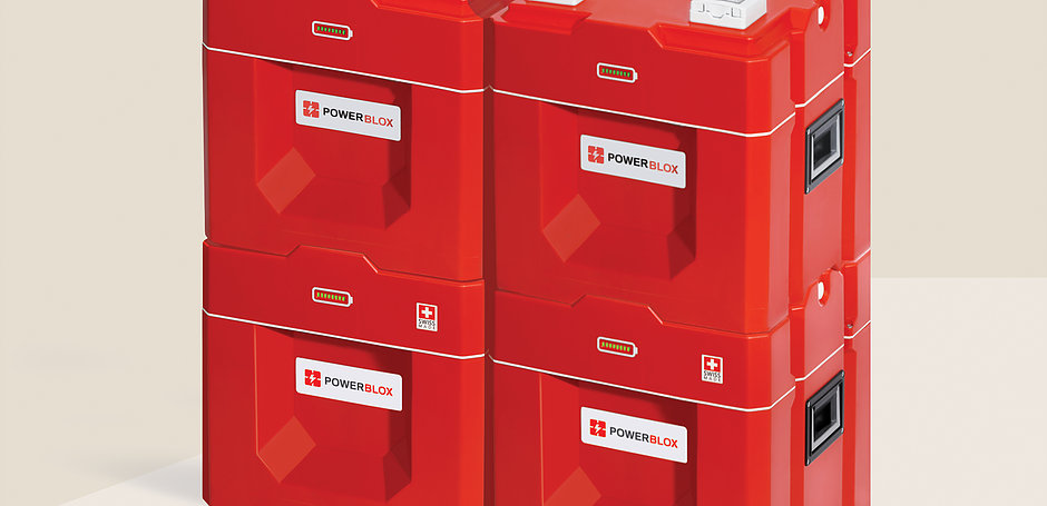 Etualalla on esillä kaapeleita ja Koestusliittimiä, taustalla suuria keloja, tehomuuntajia ja akkuvarastoja sekä vasemmalla aurinkopaneelirivejä pilvisen taivaan alla.
